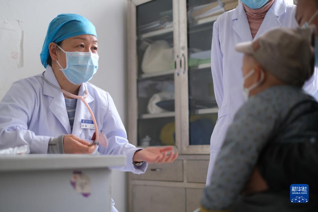4月25日,青海省人民醫(yī)院醫(yī)生、青南支醫(yī)隊員王菲在青海省玉樹藏族自治州人民醫(yī)院給患者進行檢查。新華社記者 韓方方 攝
