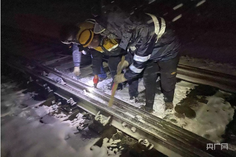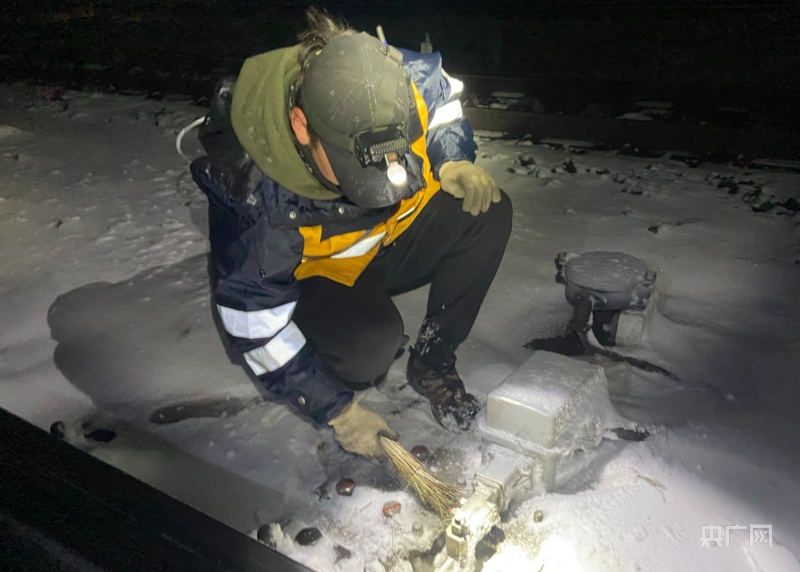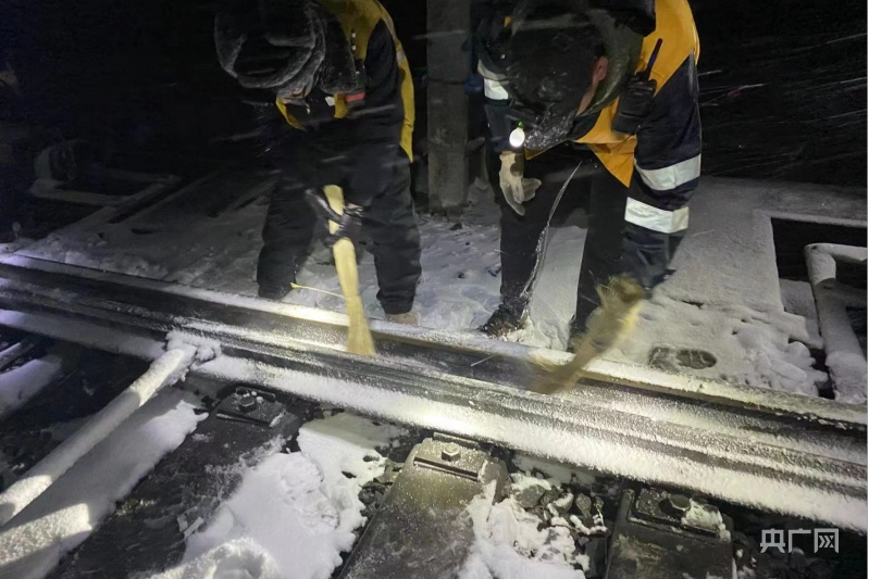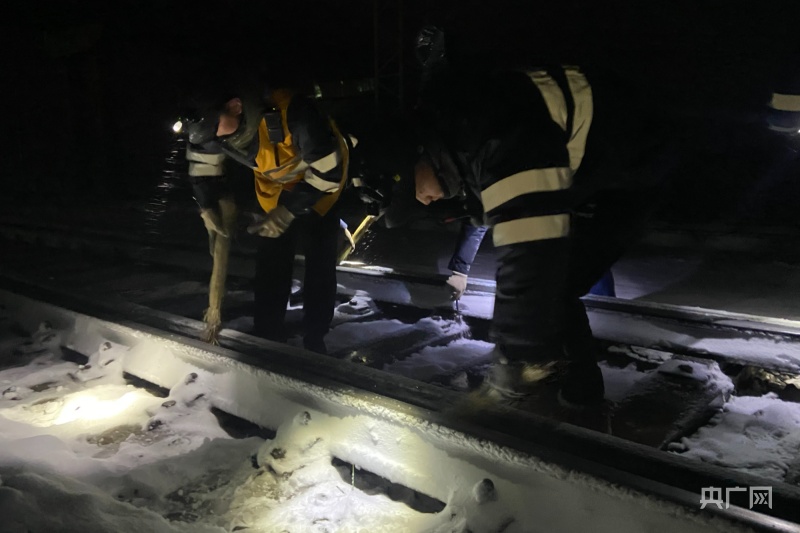 深夜風(fēng)雪中,清掃道岔滑床板。央廣網(wǎng)發(fā) 余國棟 攝