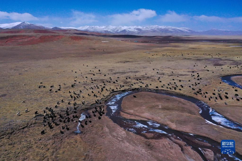4月19日,在青海省玉樹藏族自治州治多縣,牦牛在覓食(無人機(jī)照片)。新華社記者 張龍 攝