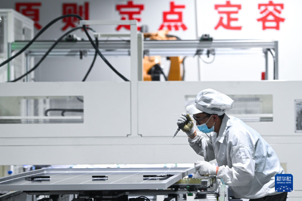 6月7日,青海隆基樂葉光伏科技有限公司工人在廠區(qū)加工光伏組件。新華社記者 周盛盛 攝