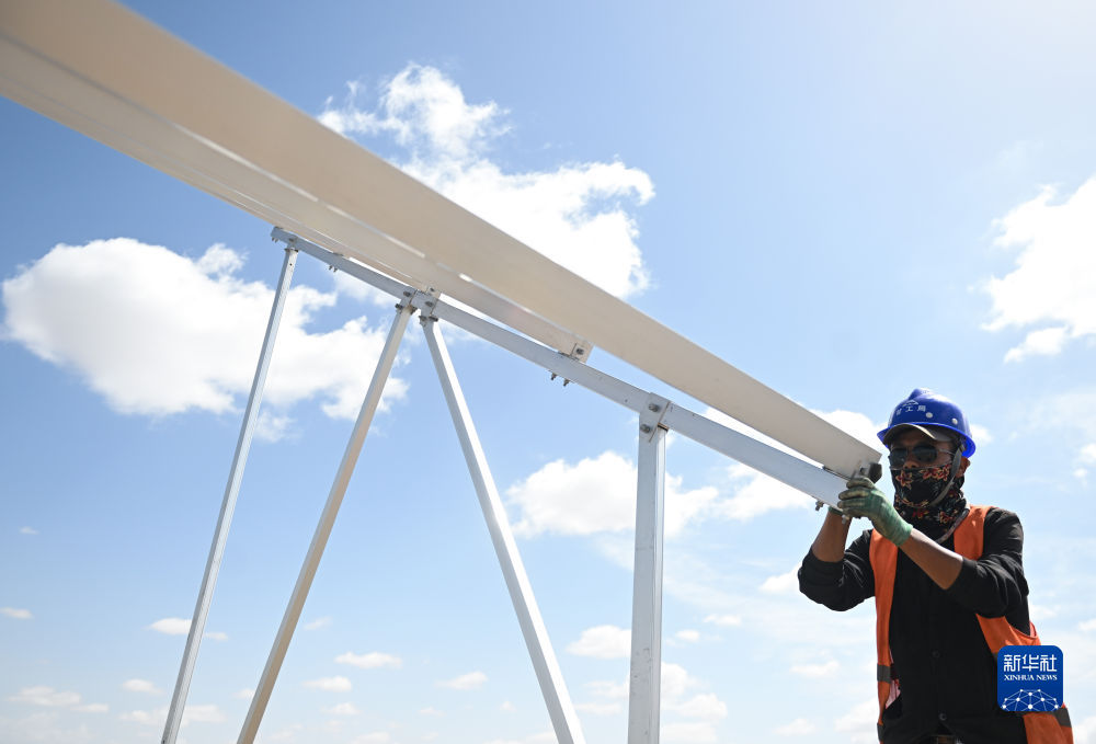 6月8日,工人在黃河上游水電開發(fā)有限責任公司海南基地共和縣100萬千瓦光伏項目現(xiàn)場施工。新華社記者 駱曉飛 攝