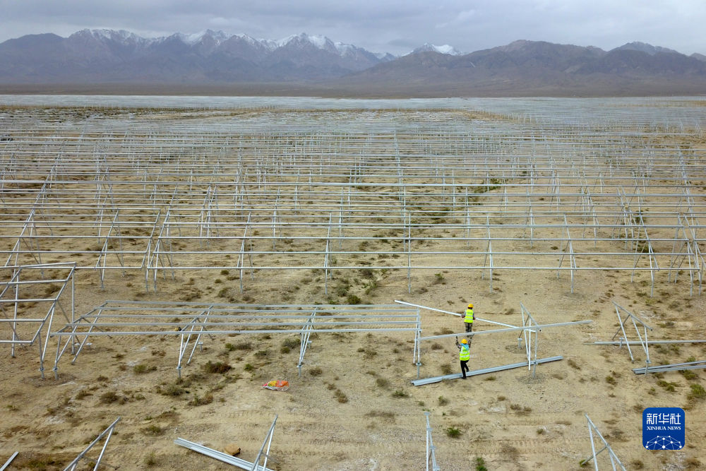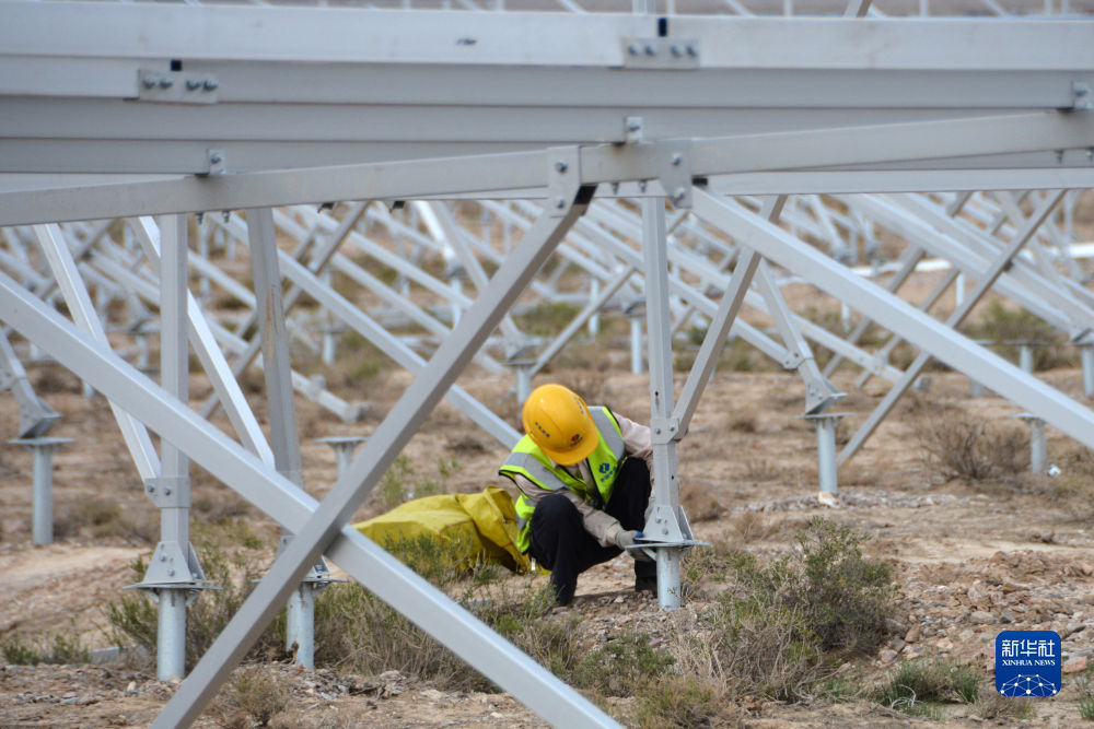 6月7日,在國家電投集團(tuán)黃河公司德令哈220萬千瓦多能互補(bǔ)項目一期100萬千瓦光伏項目建設(shè)現(xiàn)場,工人在安裝光伏支架。新華社記者 王浡 攝
