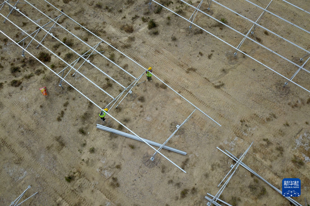 6月7日,在國家電投集團(tuán)黃河公司德令哈220萬千瓦多能互補(bǔ)項目一期100萬千瓦光伏項目建設(shè)現(xiàn)場,工人安裝光伏支架(無人機(jī)照片)。新華社記者 范培珅 攝