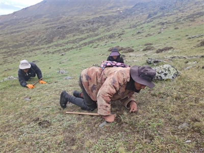 貢呷洛珠穿著棉襖,腿上綁著橡膠護(hù)膝,雙膝跪在草地上,俯身搜尋。與他結(jié)伴的是村里的恩珠夫妻倆,他們也趴著身子,不放過眼前的每一寸草地。