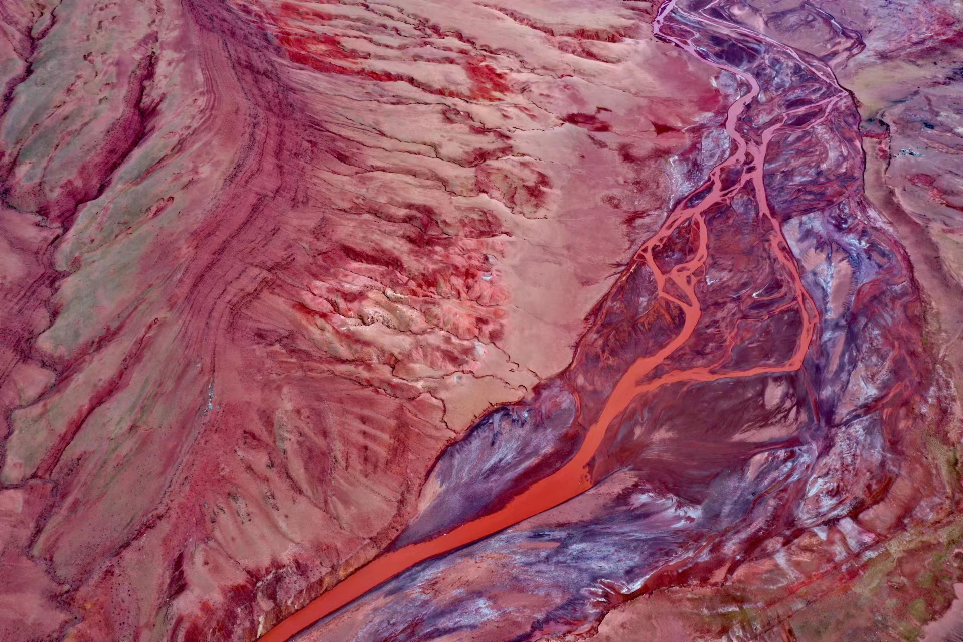 青藏公路日阿尺曲一帶發(fā)現(xiàn)的紅色山脈。張永攝