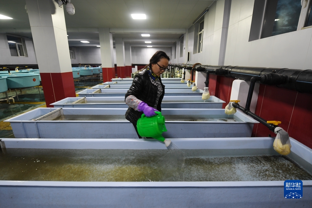 6月29日,在青海湖裸鯉沙柳河泉吉河增殖實(shí)驗(yàn)站,工作人員給條形培育槽中的湟魚苗灑喂調(diào)配的營(yíng)養(yǎng)液。新華社記者 范培珅 攝
