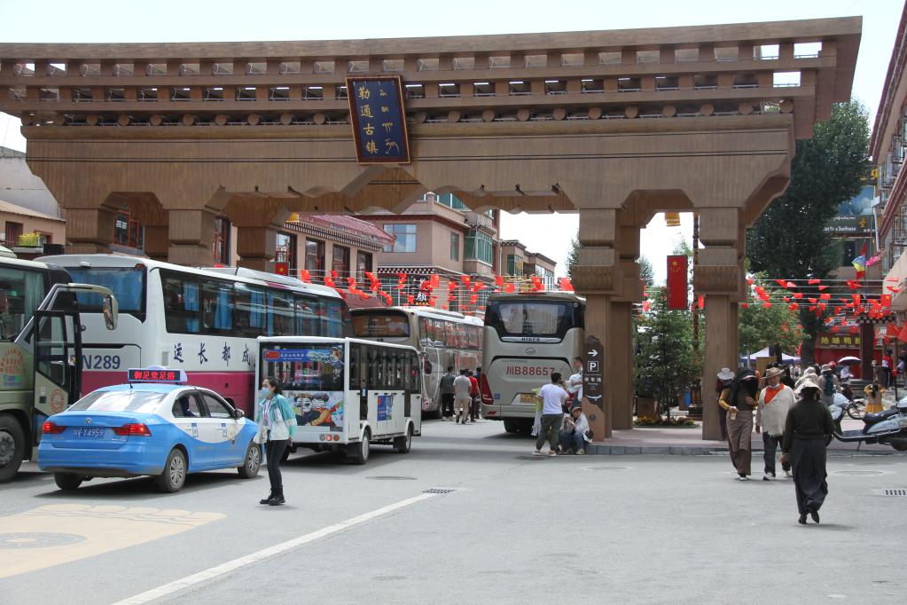 旅游包車(chē)游客進(jìn)入理塘縣勒通古鎮(zhèn)景區(qū)。(理塘縣委宣傳部供圖)