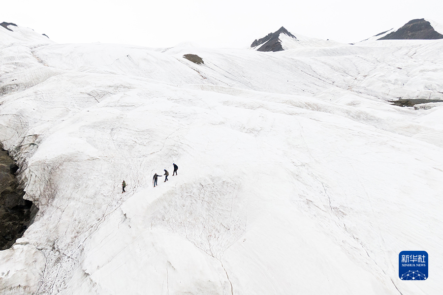 7月28日,來自長(zhǎng)江科學(xué)院的科考隊(duì)員在長(zhǎng)江源格拉丹東雪山上(無(wú)人機(jī)照片)。新華社記者肖藝九 攝