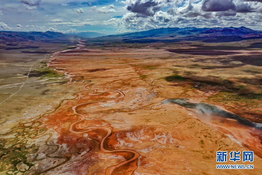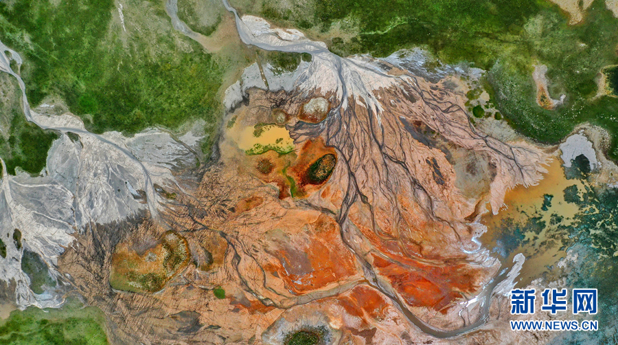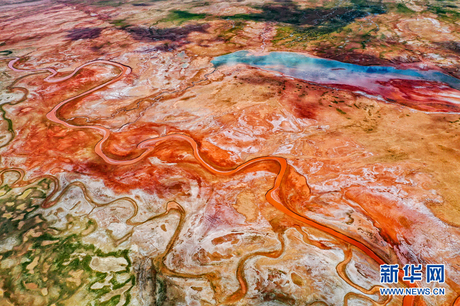 高空俯瞰阿拉克湖國(guó)家濕地公園,大地紋理清晰、赤紅嫩綠分明。