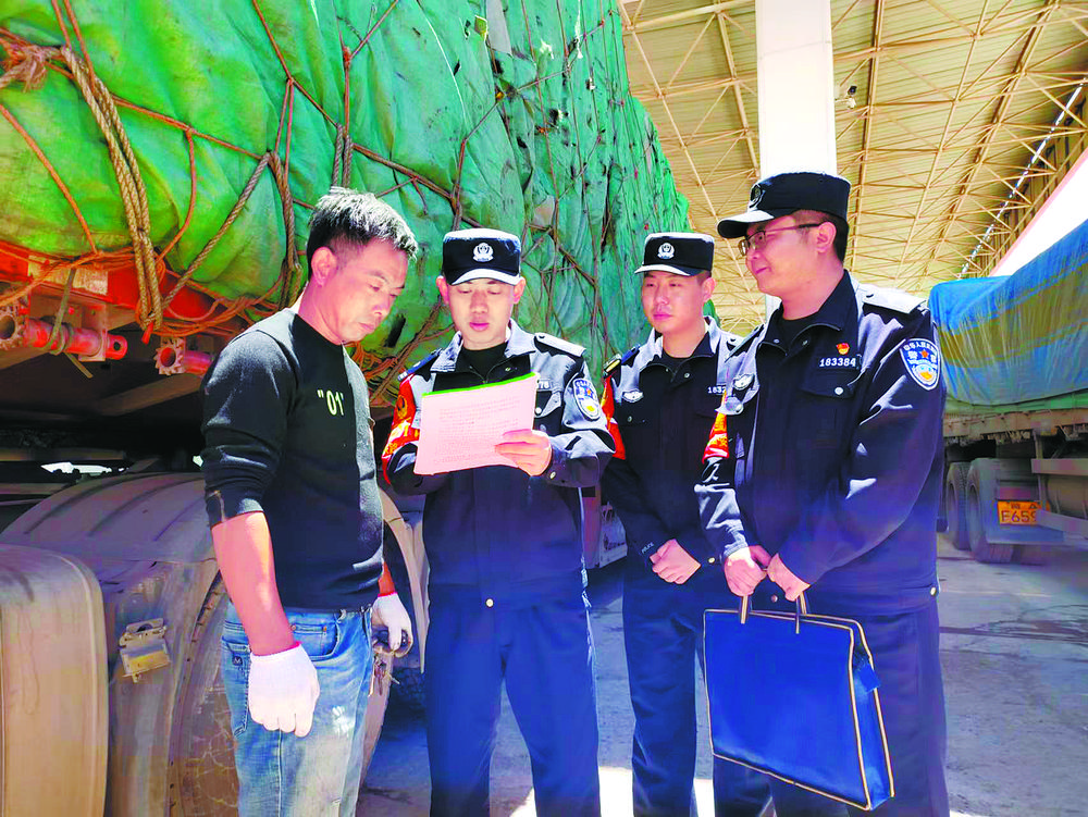 沱沱河站派出所所長沈衛(wèi)平(左二)和民警們一起向客車司機宣傳愛路護路知識。青藏鐵路公安局格爾木公安處供圖