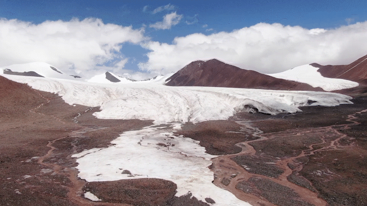 抬頭,是皚皚白雪冰川;腳邊,是冰雪融水奔流。厚厚冰蓋嵌入山谷中,冰川融水隨著河谷順勢(shì)而下,匯入長(zhǎng)江源水系。
