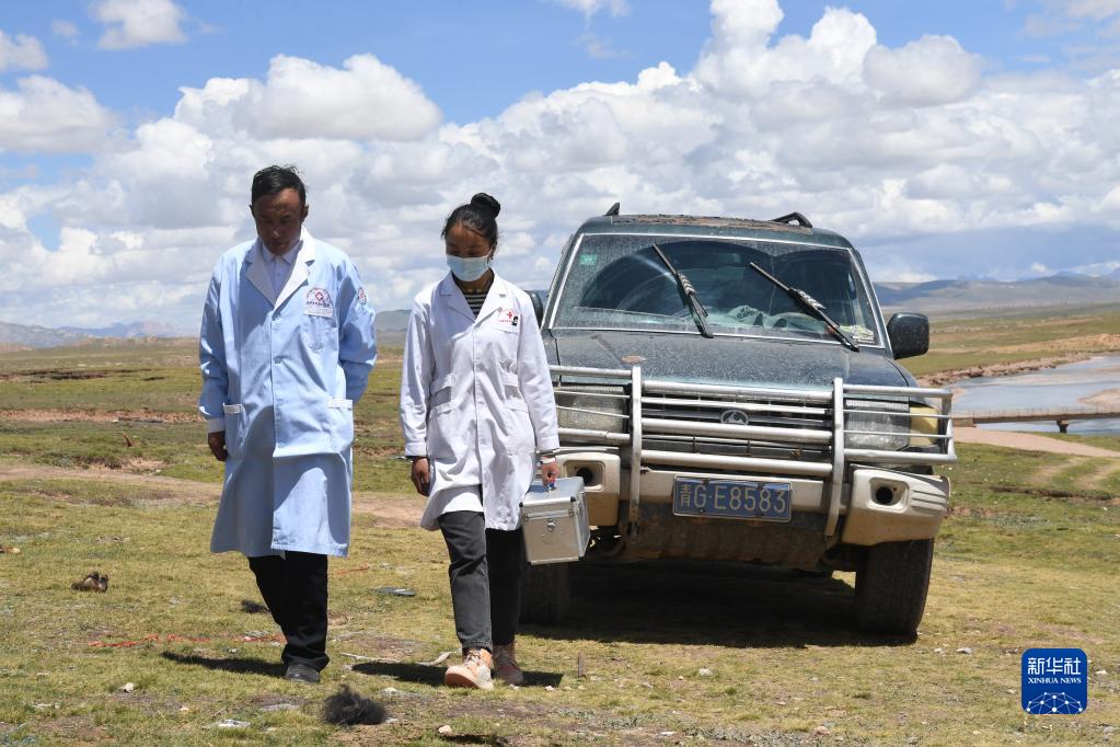 在治多縣索加鄉(xiāng)當(dāng)曲村,布久索南更青(左)和同事前往牧民家中問診(8月11日攝)。新華社記者 范培珅 攝