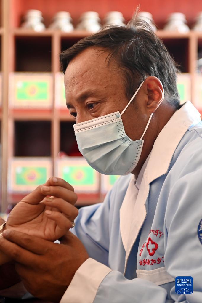 在治多縣索加鄉(xiāng)衛(wèi)生院,布久索南更青為患者把脈(8月11日攝)。新華社記者 范培珅 攝