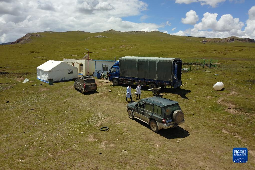 在治多縣索加鄉(xiāng)當(dāng)曲村,布久索南更青(左)和同事一起前往牧民家中問診(8月11日攝,無人機(jī)照片)。新華社記者 范培珅 攝