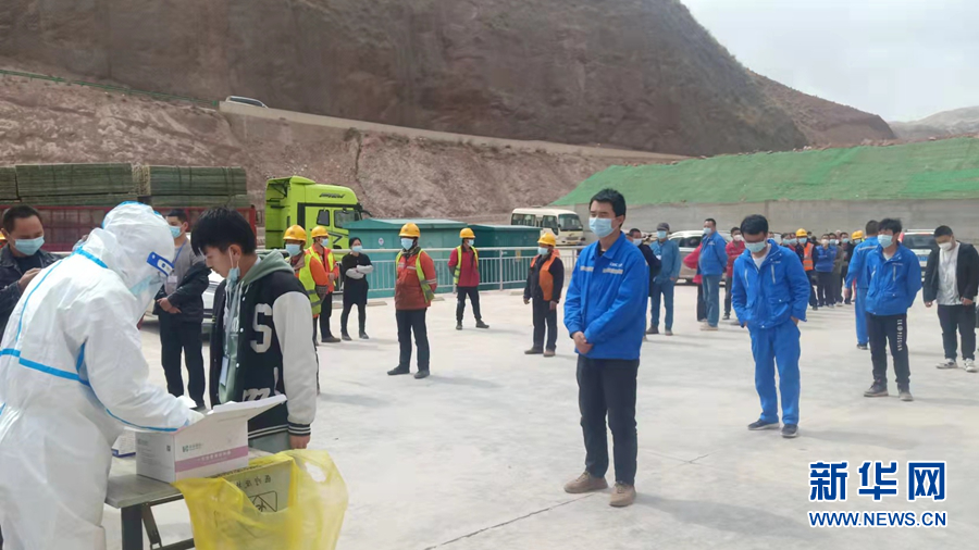 瑪爾擋水電站建設現(xiàn)場,施工人員排隊進行核酸檢測。新華網(wǎng) 劉小芳 攝