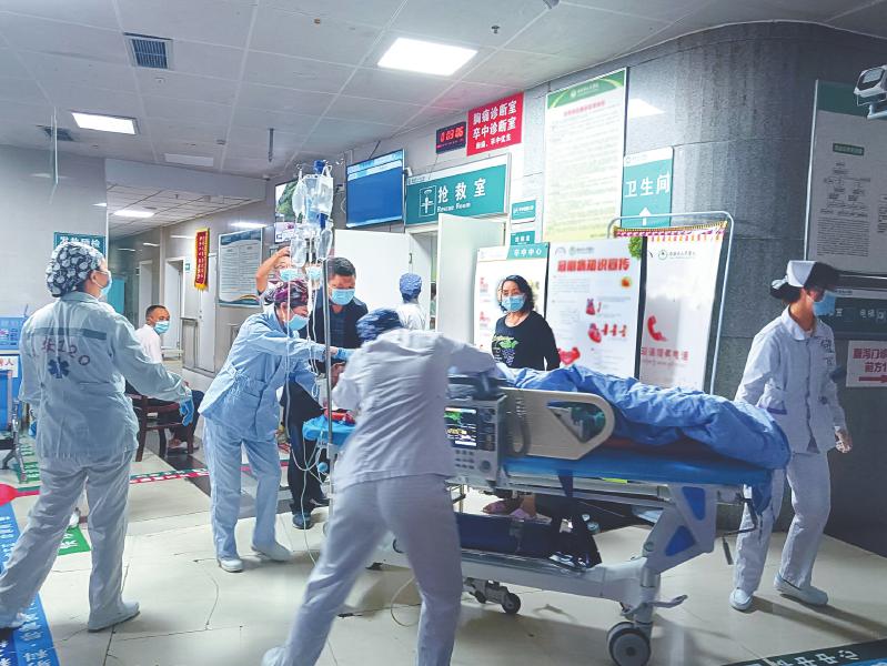 9月6日凌晨,甘孜州瀘定縣人民醫(yī)院燈火通明,醫(yī)護人員正對地震傷員開展緊急救治。醫(yī)院門口??康木茸o車警報燈閃爍不停,接到命令后,警笛在深夜鳴響,汽車迅速啟動前去接診傷員。