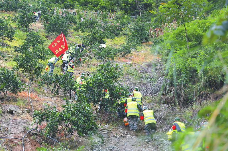 石棉縣武裝部救援小組徒步挺進草科鄉(xiāng)。 黃剛 攝