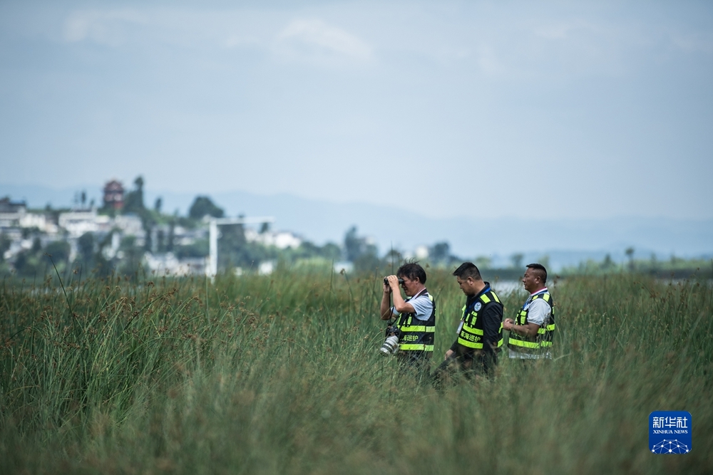 貴州草海國家級自然保護區(qū),草海巡護隊副大隊長劉廣惠(左一)和隊員在日常工作巡護中(2021年7月8日攝)。新華社記者 陶亮 攝