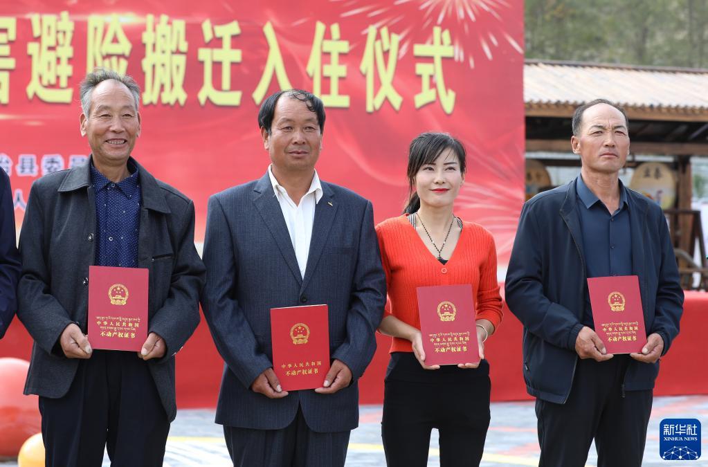 9月15日,在甘肅省武威市天祝藏族自治縣生態(tài)及地質(zhì)災(zāi)害避險(xiǎn)搬遷入住儀式上,祁連鎮(zhèn)116戶群眾拿到不動(dòng)產(chǎn)權(quán)證書,入住新房。作為生態(tài)脆弱地區(qū),天??h通過生態(tài)及地質(zhì)災(zāi)害避險(xiǎn)搬遷工作,嘗試解決地質(zhì)災(zāi)害威脅和發(fā)展受限問題。