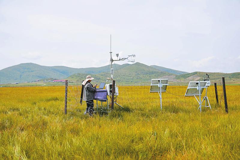 四川若爾蓋高寒濕地生態(tài)系統(tǒng)國家野外科學(xué)觀測研究站高寒濕地綜合觀測場內(nèi),工作人員正在下載數(shù)據(jù)。
