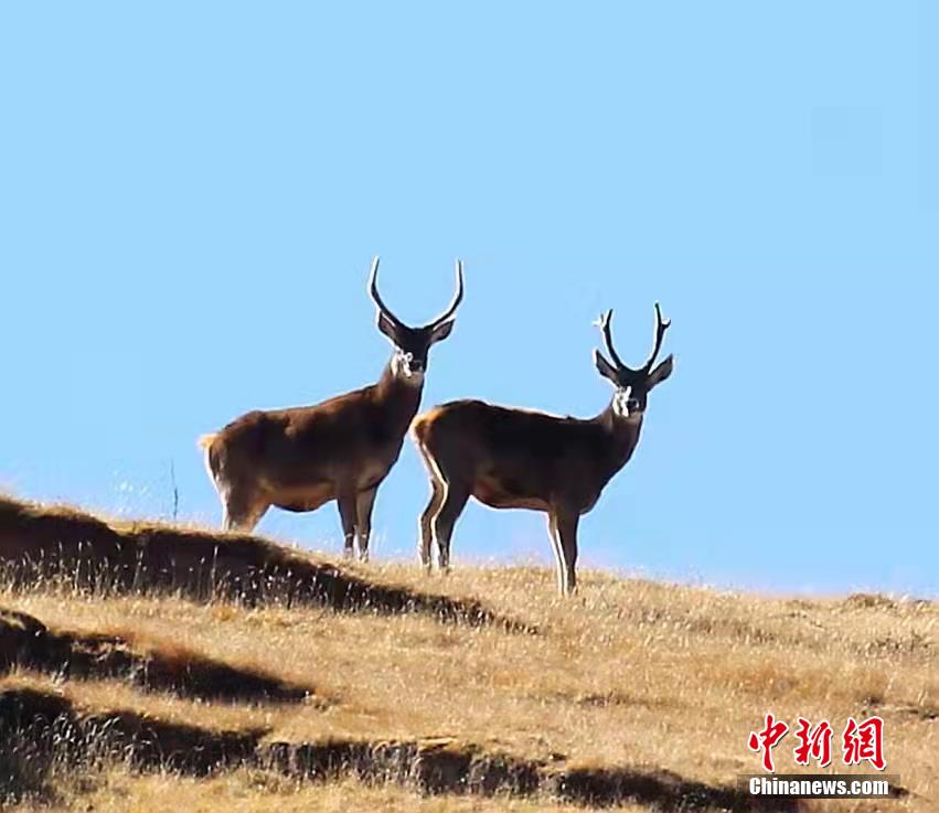 圖為兩頭白唇鹿在遠眺。才讓扎西 攝