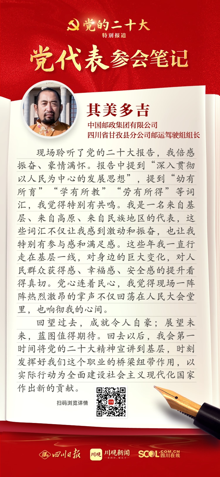 出席盛會,來自四川的黨代表深感使命光榮、責任重大,大家認真履職,結(jié)合報告談?wù)J識、談體會、談打算。川觀新聞特此推出“黨代表參會筆記”欄目,分享黨代表們的參會心得,敬請垂注。