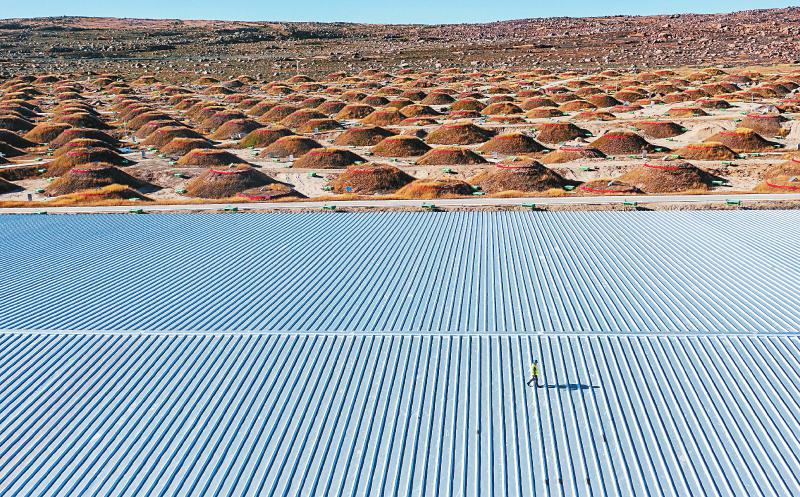 10月21日,科研人員行走在水切倫科夫探測(cè)器的屋頂上。遠(yuǎn)方的每個(gè)大概36平方米的土堆是拉索的繆子探測(cè)器,放置了裝有超純水的高反射率水袋。