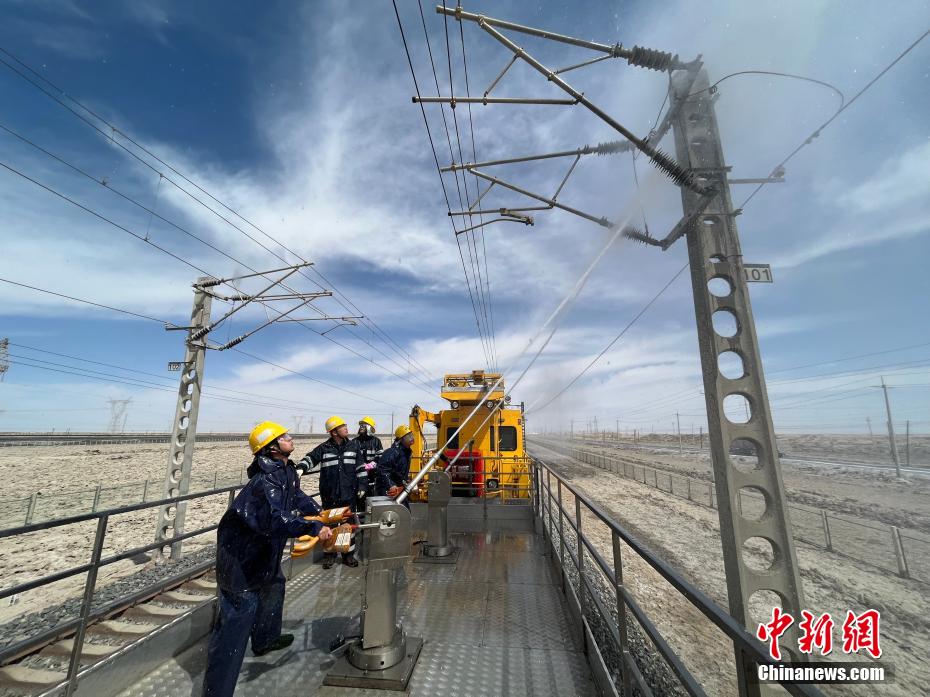 而之所以要沖洗絕緣子,是因?yàn)榍嗖罔F路察爾汗段空氣中鹽分含量高,很容易在鐵路接觸網(wǎng)絕緣子上形成鹽污,如果不及時(shí)清除,會造成跳閘或線路短路,影響列車供電、損害列車元器件,進(jìn)而威脅列車運(yùn)行安全。