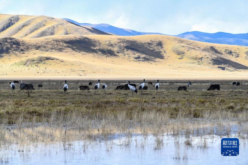 一群國家一級保護(hù)動物黑頸鶴在四川省阿壩藏族羌族自治州若爾蓋縣的濕地活動(2022年10月17日攝)。新華社記者 王曦 攝