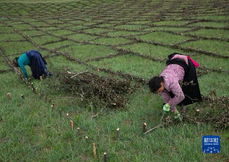 在若爾蓋縣麥溪鄉(xiāng)黑河村,村民用高原柳編成沙障(2022年7月25日攝)。新華社記者 江宏景 攝