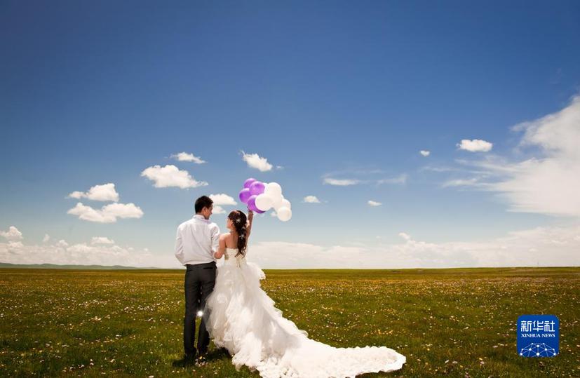 四川若爾蓋濕地國家級自然保護(hù)區(qū)鮮花盛開時節(jié),一對情侶在拍攝婚紗照(2022年6月24日攝)。新華社記者 江宏景 攝