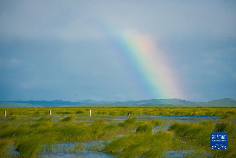 四川若爾蓋濕地國家級自然保護(hù)區(qū)若爾蓋花湖上空出現(xiàn)一道彩虹(2022年6月24日攝)。新華社記者 江宏景 攝