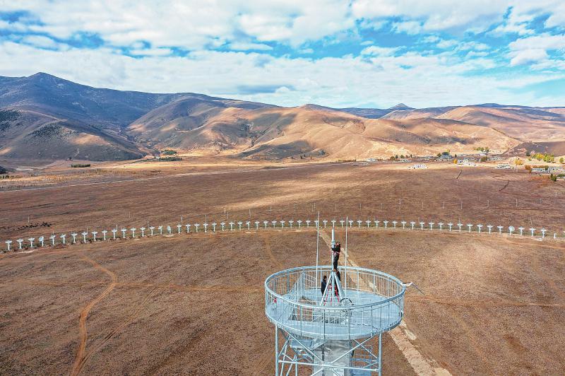 2022年11月13日 工人正在安裝圓環(huán)陣太陽射電成像望遠(yuǎn)鏡設(shè)備的最后一個天線面。