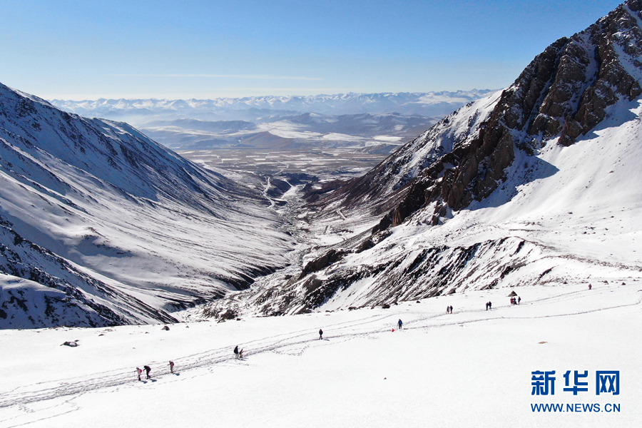 2022年1月1日,登山愛(ài)好者攀登崗什卡雪峰(無(wú)人機(jī)照片)。新華社記者 張龍攝