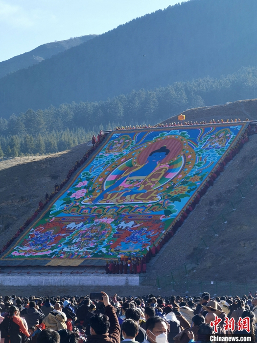 2月3日,中國農(nóng)歷正月十三,時隔三年,有“世界藏學(xué)府”之稱的甘肅拉卜楞寺重啟“瞻佛”活動,當(dāng)日展曬的巨型唐卡佛像吸引7萬余僧俗民眾慕名瞻仰,祈禱新年風(fēng)調(diào)雨順、國泰民安。中新社發(fā) 屈鵬 攝