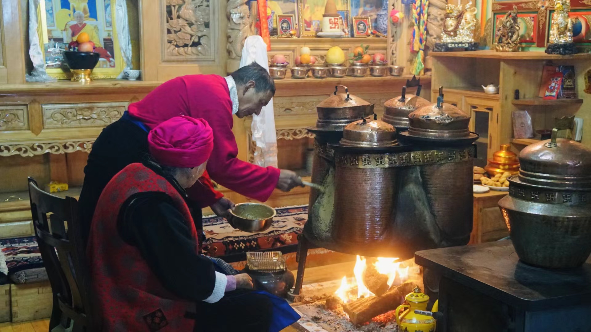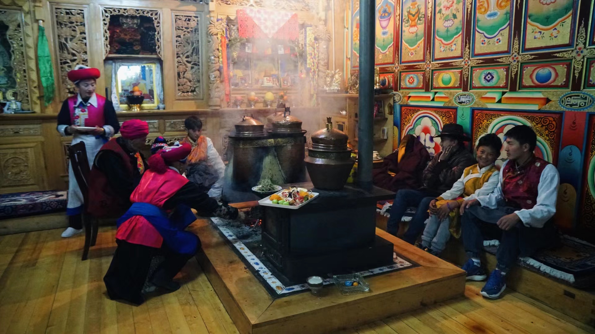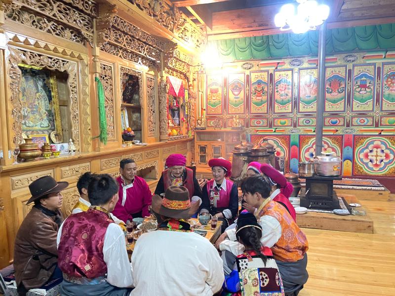 傍晚時分,“年夜飯”準備完成,初稱站在火塘邊把剛和好的稀泥一層一層地刷到火塘上,“這是藏歷新年的添新土儀式(藏歷新年接福習俗),表示我們對來年日子風調雨順、紅紅火火的美好期待?!背醴Q把這些傳統(tǒng)習俗認真地教給家里的孩子們。