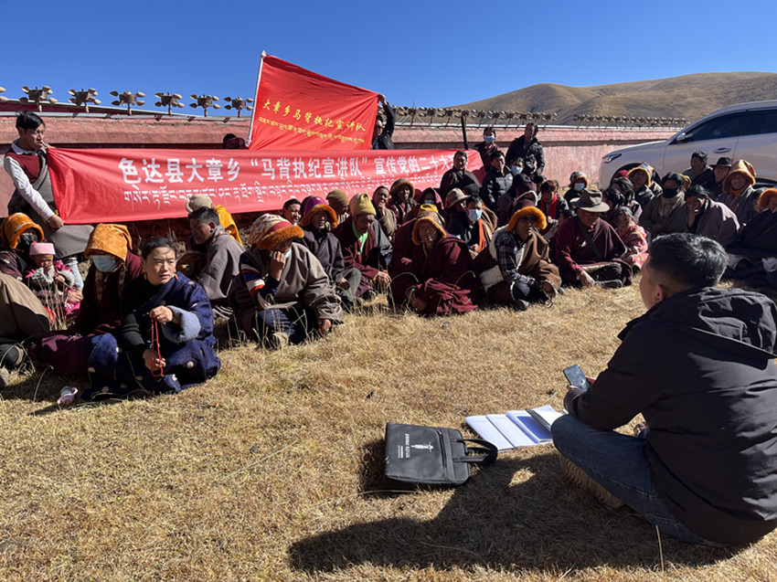 “針對色達高寒偏遠、地廣人稀,牧區(qū)群眾生活居住較分散的情況,我們調(diào)配縣鄉(xiāng)村三級紀檢監(jiān)察力量,逐步組建起精通藏漢雙語、熟悉紀法知識、擅長群眾工作的馬背執(zhí)紀宣講隊,把黨的聲音傳遞到云端藏寨、天邊牧場?!鄙_縣紀委書記、監(jiān)委主任陳玉龍介紹,黨的二十大以來,宣講隊已開展宣講活動20余場次,推動為群眾辦實事10余件,解決困難訴求20件。