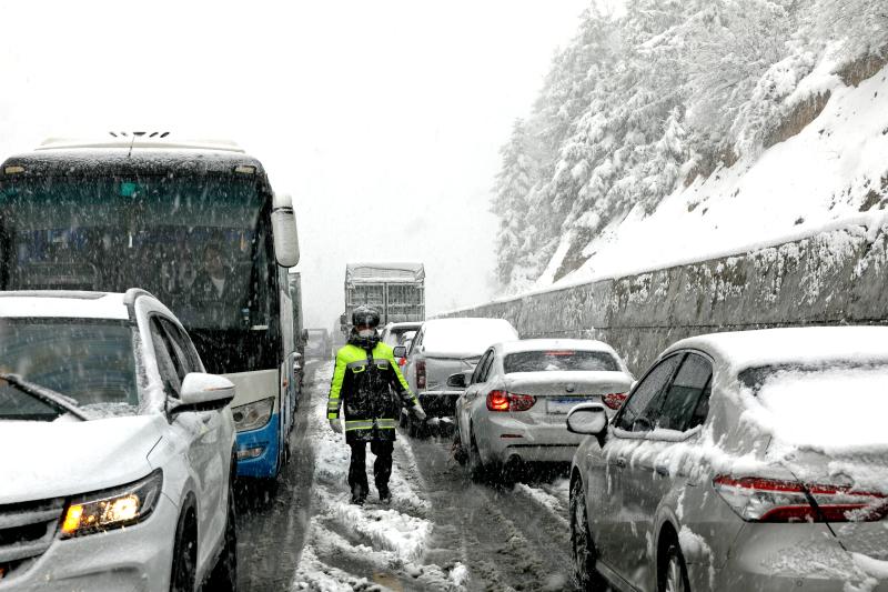 2月22日,大雪使白馬雪山路面積雪結(jié)冰,導(dǎo)致上百輛汽車擁堵滯留,交警冒著嚴寒疏導(dǎo)交通。