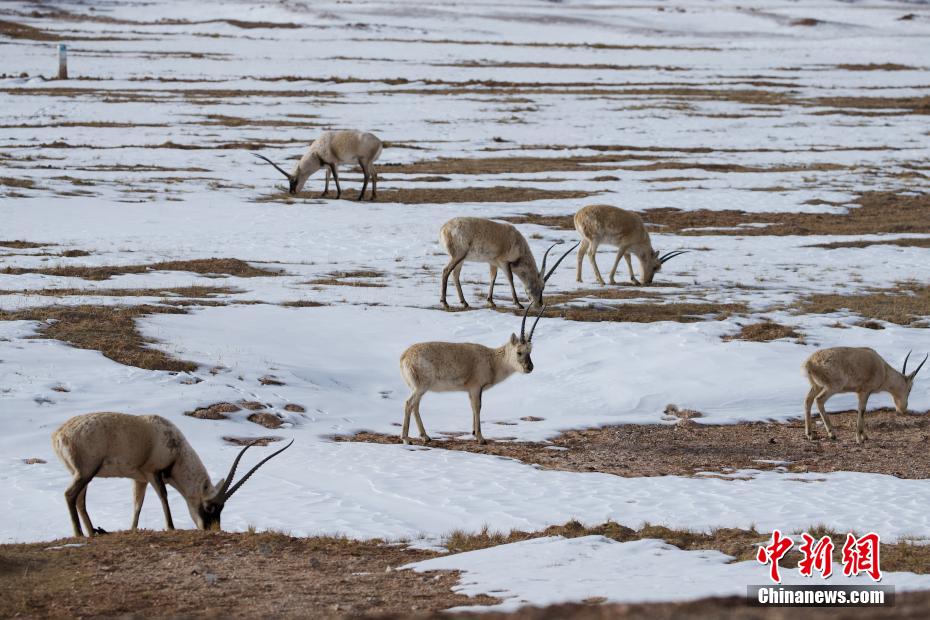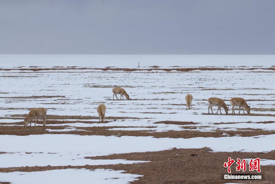 日前,可可西里地區(qū)降下春雪,在109國(guó)道五道梁附近,成群的藏羚羊在道路兩旁覓食、棲息,自由愜意。