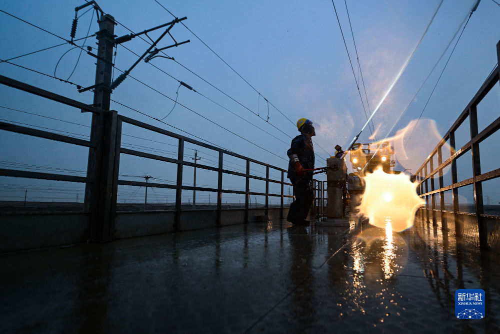 4月20日,中國(guó)鐵路青藏集團(tuán)有限公司西寧供電段格爾木大修車間大修網(wǎng)工區(qū)檢修工使用高壓沖洗水槍對(duì)絕緣子設(shè)備進(jìn)行清洗。新華社記者 張龍 攝