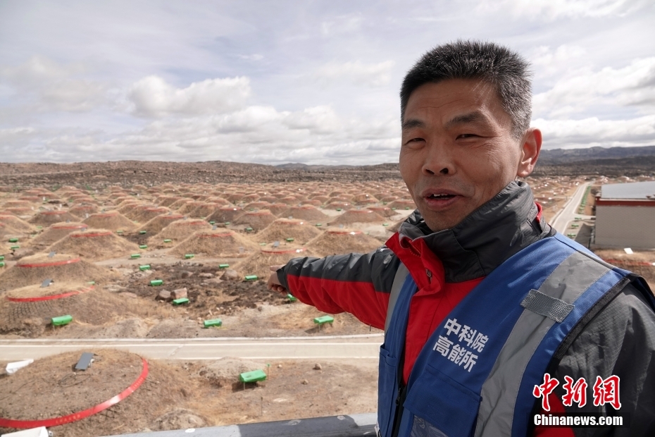 圖為國家驗收之前的4月22日,四川稻城海子山,“拉索”總工藝師、中國科學(xué)院高能物理研究所研究員何會海介紹大科學(xué)裝置建設(shè)相關(guān)情況。中新社記者 孫自法 攝