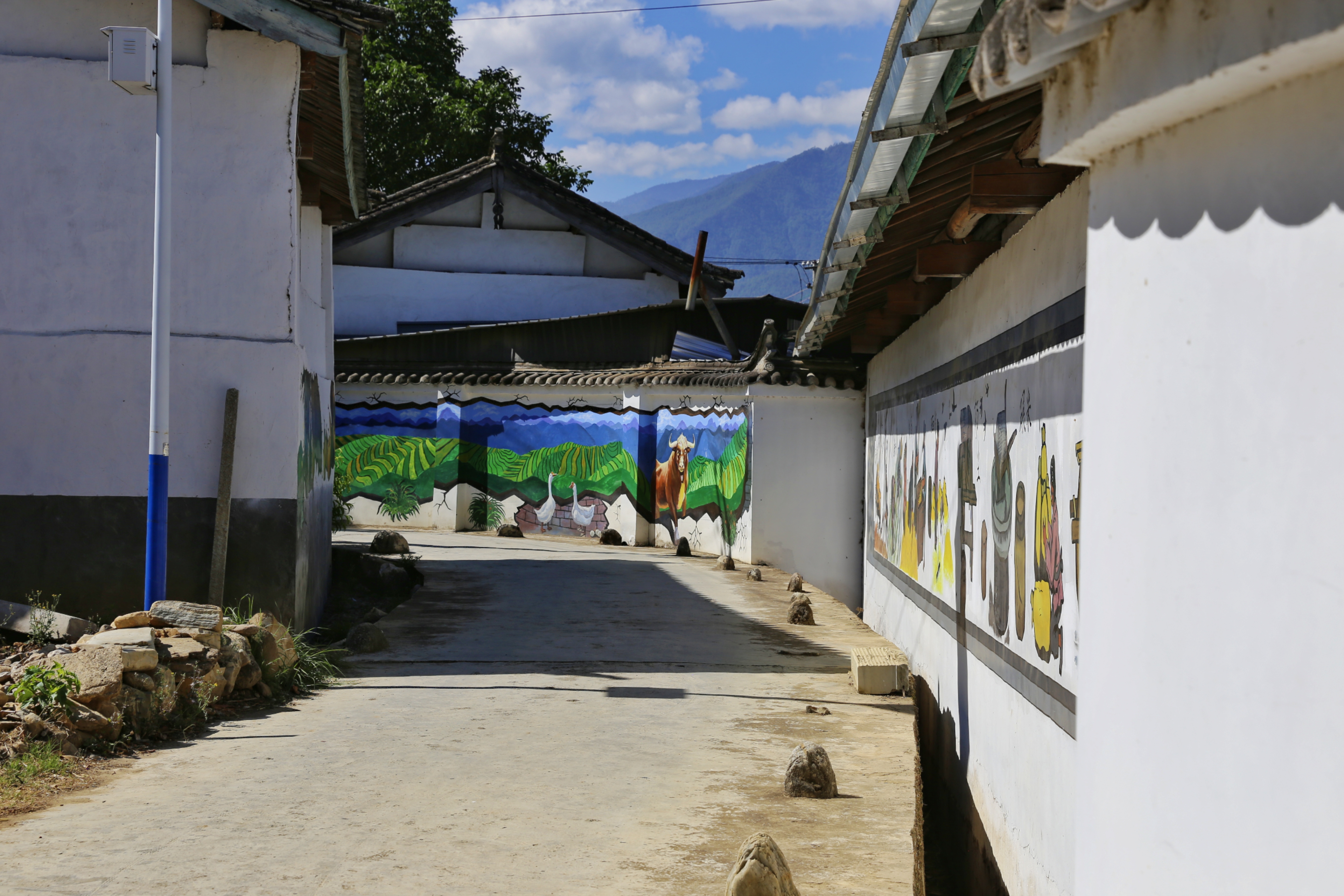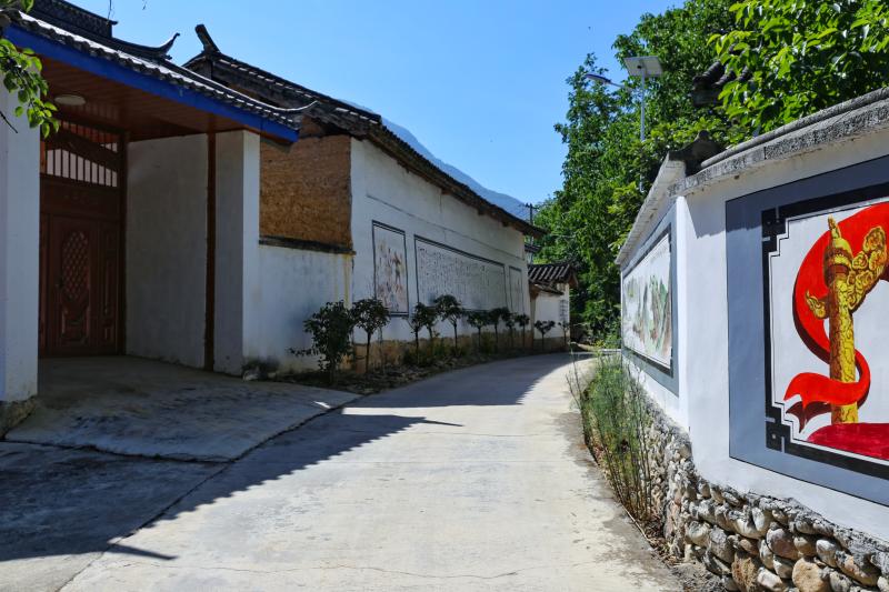 初夏時(shí)節(jié),走進(jìn)香格里拉市金江鎮(zhèn)吾竹村堆滿(mǎn)一組,映入眼簾的是遠(yuǎn)山青黛、碧水田園,房前屋后古樹(shù)紅花相映,鄉(xiāng)間小道兩側(cè)果樹(shù)成蔭,一幅幅包含該村文化歷史的彩繪躍然墻上,漫步其間好不愜意。