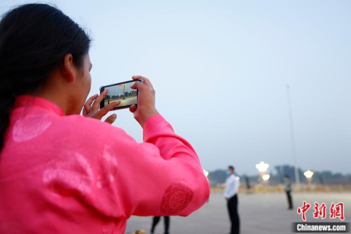 “六一”兒童節(jié)一早,來自青海省玉樹藏族自治州兒童福利院的部分藏族青少年在天安門廣場觀看升旗儀式。圖為鬧增拉毛在拍攝五星紅旗。中新社富田 攝