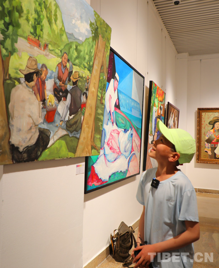 孩子們尤其喜歡美術(shù)館,對(duì)色彩斑斕的畫(huà)作興趣更大。五年級(jí)的公卻西然指著一幅藏族群眾過(guò)林卡的畫(huà)作做介紹,“這是人們?cè)诠珗@里野餐。我們喜歡這樣的活動(dòng)。”聽(tīng)隨團(tuán)的老師介紹,在玉樹(shù),到了夏天也會(huì)常帶孩子們?nèi)ヒ安屯嫠?。吃著零食、在?shù)蔭下或玩游戲或打鬧說(shuō)笑,實(shí)在太愜意了。