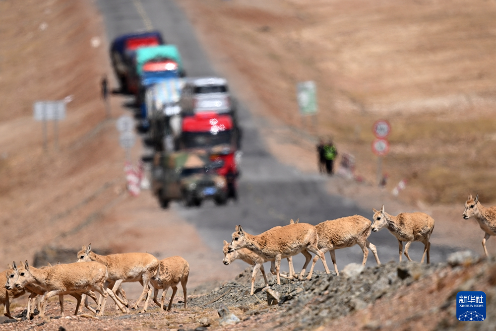 眼下,可可西里藏羚羊進(jìn)入遷徙產(chǎn)仔高峰期,記者近日在青藏公路3001公里處看到,成群的雌性藏羚羊在公路一側(cè)集結(jié),現(xiàn)場的工作人員對(duì)往來車輛進(jìn)行臨時(shí)交通管制。頭羊反復(fù)試探、確認(rèn)沒有危險(xiǎn)后,羊群快速通過公路,向可可西里腹地奔去。