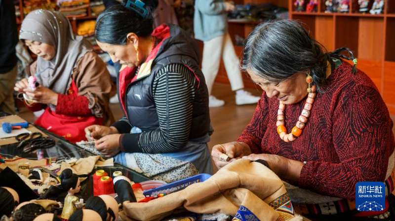 在若爾蓋縣唐克鎮(zhèn)白河社區(qū),“吉祥娃娃”手工社的社員們?cè)谥谱鳌凹橥尥蕖?。新華社記者 尚文意 攝