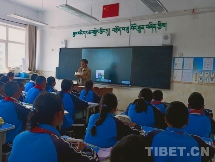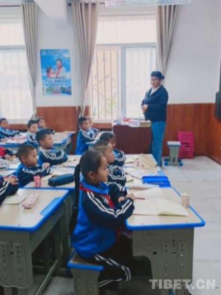 圖為該校藏文老師加羊卓姆為六年級學生講授文法