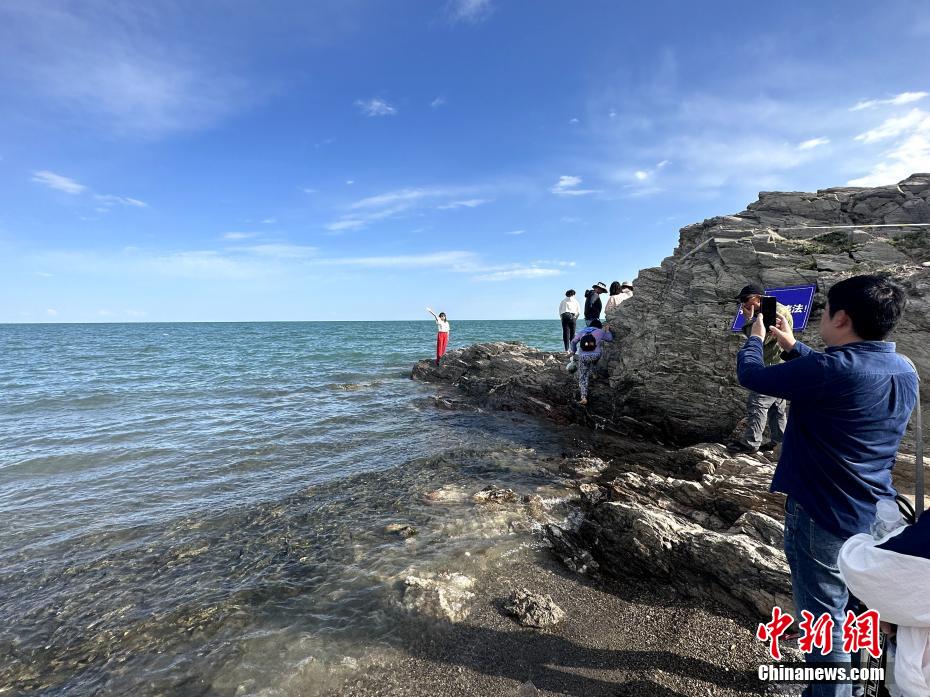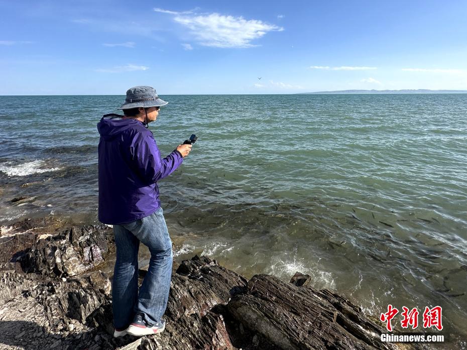 圖為游客在青海湖斷崖湟魚(yú)密集處留影。李雋 攝