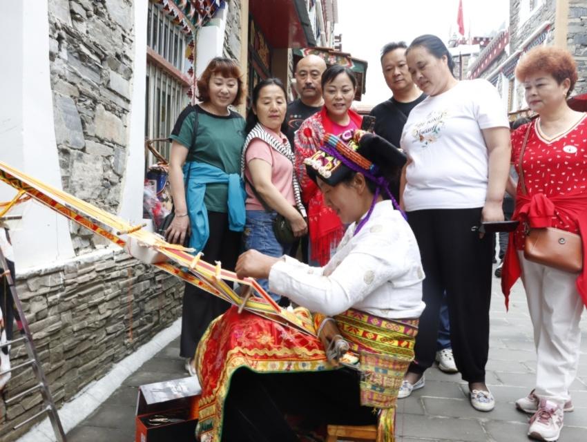 在理縣古爾溝鎮(zhèn)丘地村,54歲的藏族阿媽澤朗斯基端坐家門前,動(dòng)作嫻熟地操作著傳統(tǒng)腰機(jī),編織一款藏式花腰帶。只見她靈巧的雙手來(lái)回推拉木梭,不時(shí)變換著經(jīng)線,不一會(huì)兒,五彩的絲線就化為明艷動(dòng)人的吉祥紋樣,在織布上綻放開來(lái)。