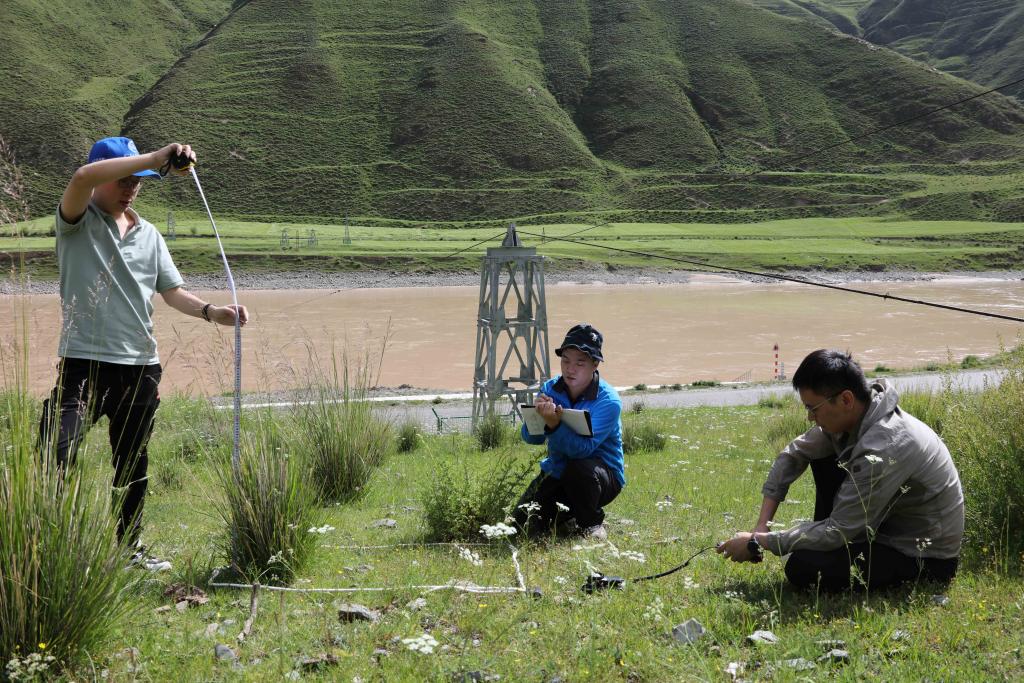 7月22日,長江科學(xué)院水土保持研究所的科考隊員在通天河直門達(dá)河段進(jìn)行植被樣方調(diào)查。新華社記者 劉詩平 攝